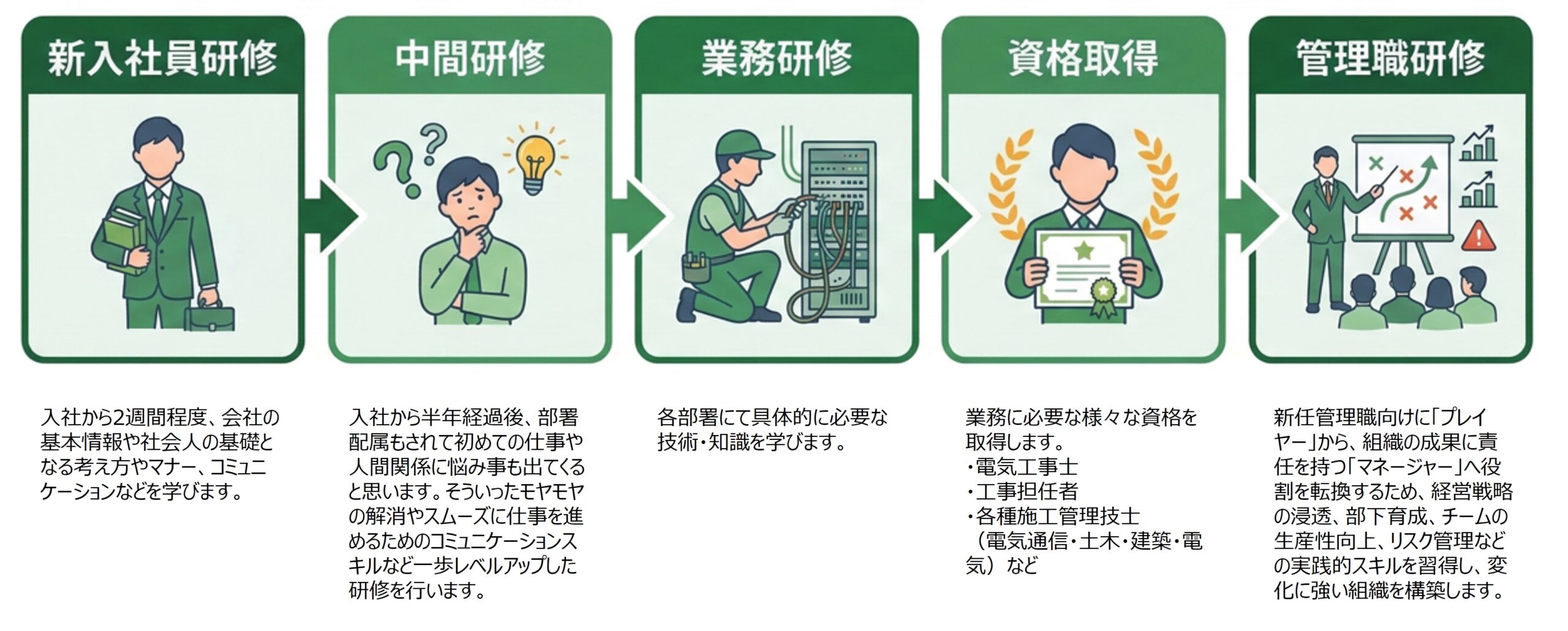 キャリアアップのための技術や資格取得はもちろん、人間性を磨き高めることにも取り組んでいます。可能性や意欲を引き出し、さらに上の目標に向けてバックアップしていきます。